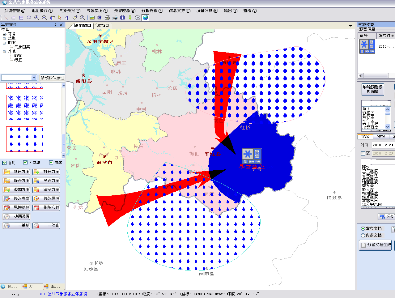 (3)应急分析:通过耦合公共气象服务系统各模块,结合画笔、图元、动画等标识、视频会商等工具,对灾情进行分析、会商、模拟、灾情处置指导等。